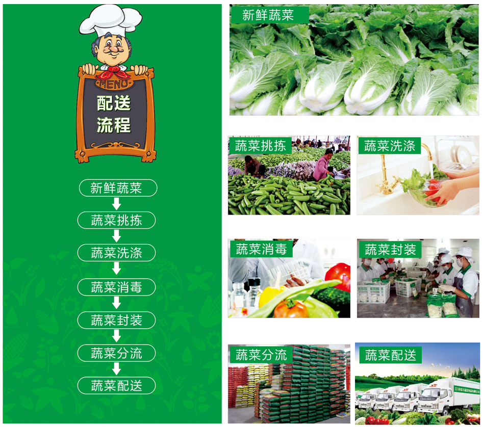 3、经过检测后的蔬菜进行密封包装,保鲜包装,从而进行配送,目前圳海蔬菜主要配送对象为集团客户,如:富士康;一汽大众等大型企业集团。